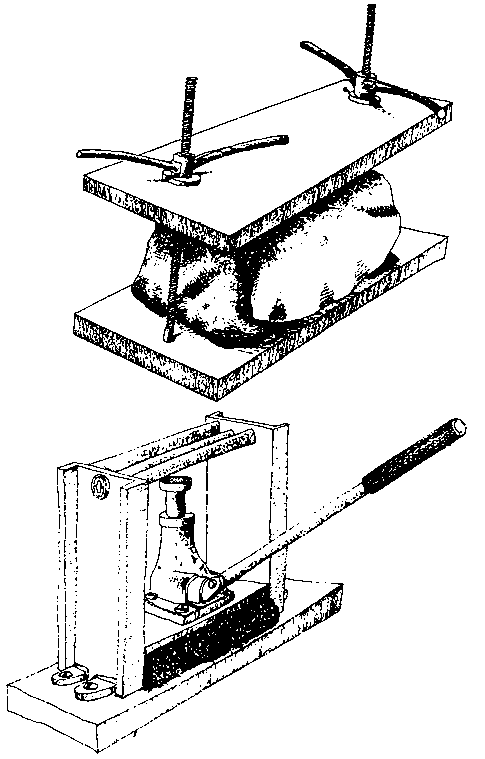 During the fermentation period the container is put under pressure by piling heavy stones on it, by strongly twisting the neck of the sacks and pressing the bag or sack between wooden poles tightened by ropes (Figure 5.6). In the latter cases the bag or sack is re-tightened every day as the liquor flows out of the cassava mash. Neither of these methods is considered as effective as the tipiti as used in South America. In this case the mash is held in a tube of a rather complicated basket weave, the diameter of which expands as it is compressed and shrinks as the tube is extended. One end of the tipiti is secured high in a tree and the other end is fastened to a lever which is subjected to a heavy downward pull by ropes, heavy stones or even by somebody sitting on it (Cock 1985).