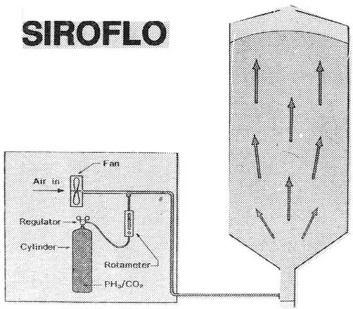The exposure time can he controlled and even extended to provide control of phosphine-resistant insects. Using the SIROFLO® system means that the grain handler can expect and get complete elimination of an infestation. SIROFLO® can he used either as a single fumigation treatment, or as a long term means of protecting grain from reinfestation. It can also be used for disinfesting parcels of grain as part of a throughput facility. The system is quite simple. A low concentration of phosphine gas from cylinders is mixed with an air stream. The air gas mixture is pumped into the base of a storage facility. The airstream produces a slight positive pressure differential that causes the gas to disperse more evenly through the entire grain mass.