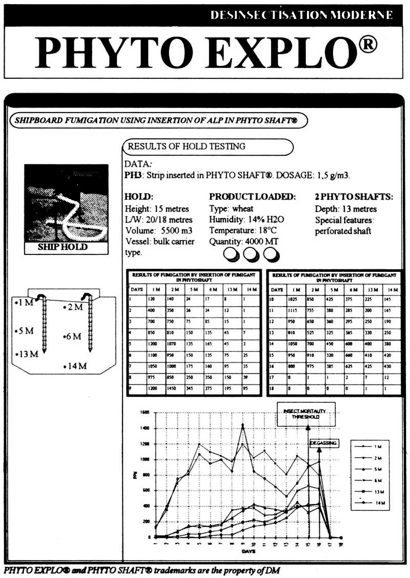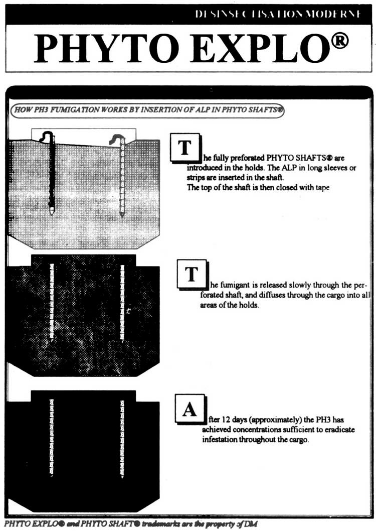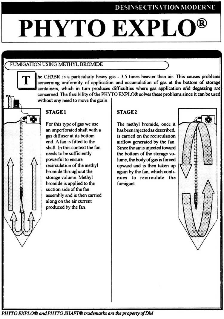 Another method of dosing developed by "Désinsectisation Moderne" for use in deeper grain bulks, is the Phyto-Explo® System, a patented method for the introduction and distribution of phosphine or methyl bromide in bulk cereals, without the need for a pre-positioned piping system.