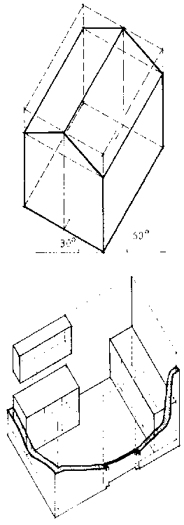An oblique projection starts with a front view of the building. The horizontal lines in the adjacent side are then draw to an angle, usually 30° or 45°, from the horizontal. The dimensions on the adjacent side are made equal to 0.8 of the full size if 30° is used or 0.5 if 45° is used. Curved and slanted lines are constructed in the same manner as in isometric projections.