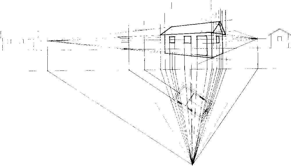 Since the technique with a window pane obviously can not be used for a proposed but still non-existing building, the perspective has to be constructed from available documentation. A perspective drawing of a building can be constructed using the plan view or, if several buildings are to be included, the site plan would be more suitable. In addition one would require elevations of all visual sides of the building(s) i.e., in the case of one building the front elevation and one end elevation.