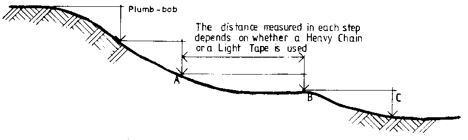When measuring for maps or site plans, horizontal distances are required. Thus when chaining on sloping land, stepping will be necessary. This procedure allows the tape or chain to be kept level, as checked with a hand or line level, while the point on the ground under the high end of the tape is located with a plumb bob as shown in Figure 2.1.