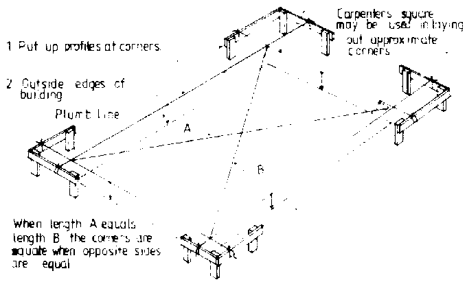 Ideally, profiles should be set up for all corners and internal walls. The profile shown at A in Figure 2.10 should be located at A1, if the foundation area is to be excavated.