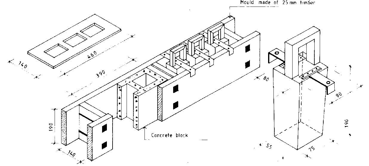 The mould illustrated in Figure 3.31 has a steel plate cut to the shape of the block which is put on as a lid and held down as the hollow-making pieces are withdrawn. Bolts are then loosened and the sides of the mould removed with a swift motion. All parts of the mould should be slightly tapered so they can be easily removed from the block.