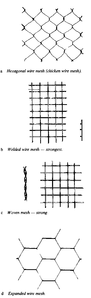 The mechanical behavior of ferrocement is dependent upon the type, quantity, orientation and strength of the mesh and reinforcing rods. Of the several types of mesh being used, the most common are illustrated in Figure 3.33.