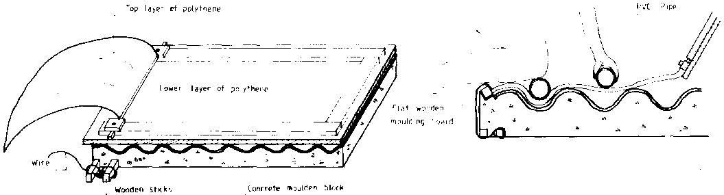 A concrete block cast over a 1m length of asbestoscement roofing is needed as a face for the casting of the roof sheets. The block is cast within a form, 100mm high, which will give a block of sufficient strength after a few days curing. Two or more 1m lengths of A-C roofing will be needed as well as a piece of 18mm plywood 1.2m by 1.2m and a sheet of heavy duty polythene 2.25m long and 1m wide. The polythene is folded in the middle and a thin batten 9mm by 15mm is stapled fast at the fold. Strips of 9mm plywood or wood are nailed along two edges of the plywood sheet leaving exactly 1 m between them as shown in Figure 3.34.
