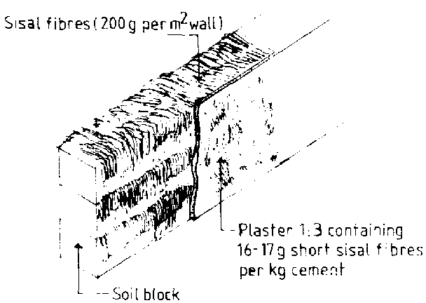 Soil blocks can be used for inexpensive walls with good thermal insulation. However, they are easily damaged by impact and eroded by rain. One way of solving these problems is to plaster the face of the wall. Ordinarily mortar plaster tends to crack and peel off as it does not expand at the same rate as the soil. This can be overcome by letting long sisal fibres pass through the wall to be incorporated into the mortar on each face. The double skin so formed provides sufficient strength and waterproofing to the wall to enable soil blocks to be laid without joining mortar between the blocks.