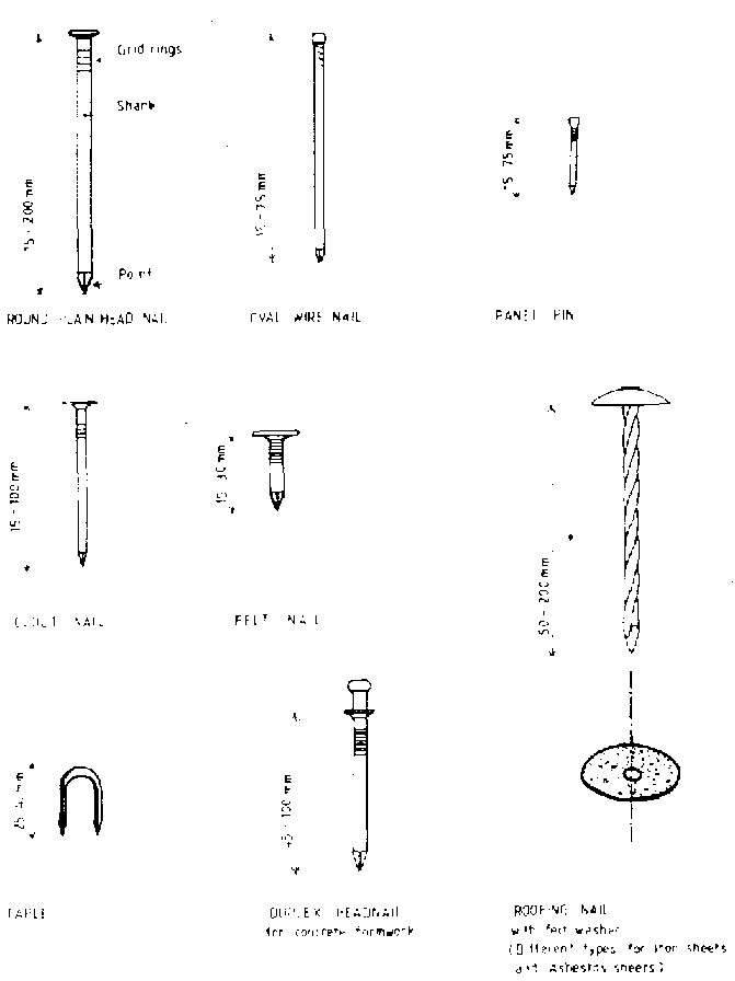 A nail relies on the grip around its shank and the shear strength of its cross-section to give strength to a joint. It is important to select the right type and size of nail for any particular situation. Nails are specified by their type, length and gauge (the higher the gauge number - the smaller the shank diameter). See Table 3.18. Most nails are made from mild steel wire. In a corrosive environment galvanized, copper-plated, copper or aluminium nails are used. A large number of types and sizes of nails are available on the market. The nails most commonly used in farm building are: