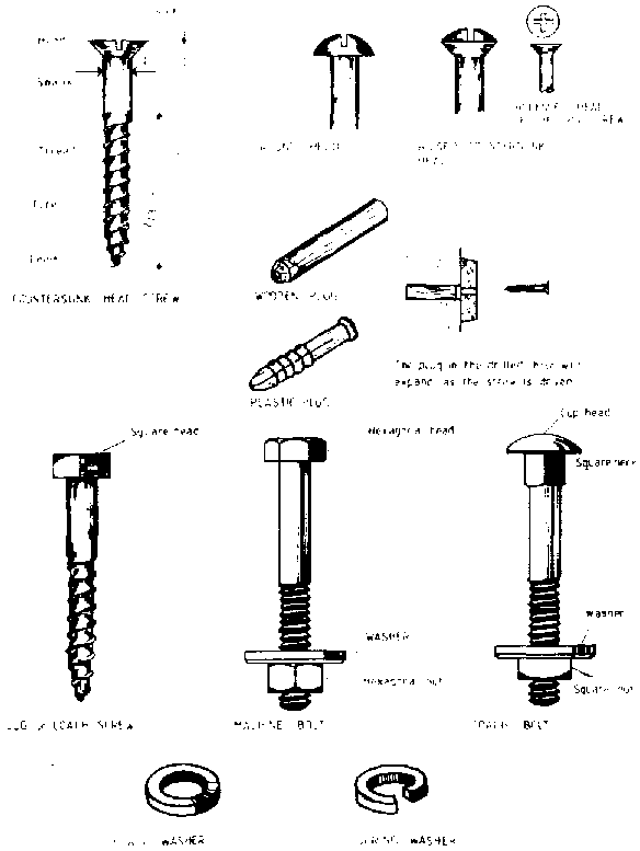 Figure 3.37 Types of wood screws and bolts.