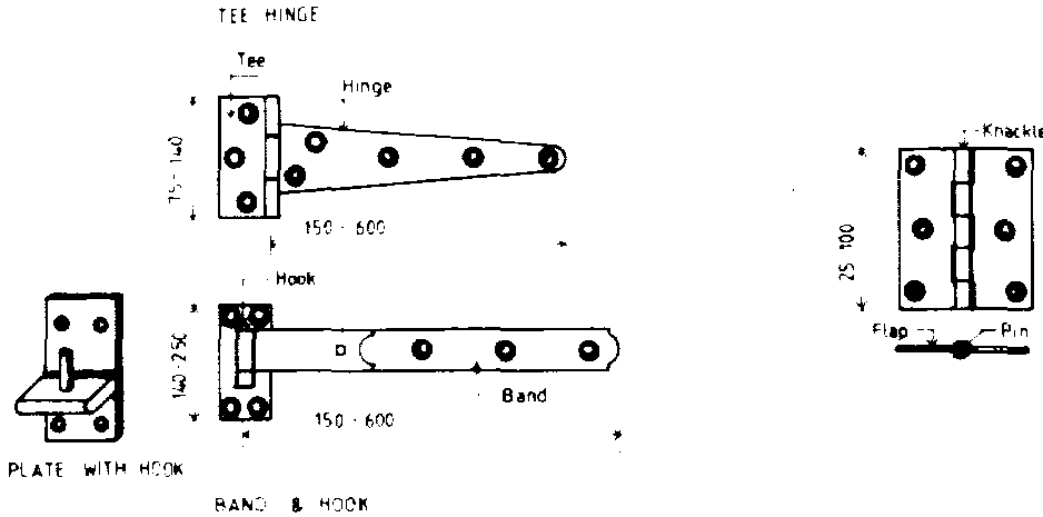 Hinges are classified by their function, length of nap and the material from which they are made and come in many different types and sizes. Hinges for farm buildings are mainly manufactured of mild steel and provided with a corrosion-inhibiting coating. The most common types are: