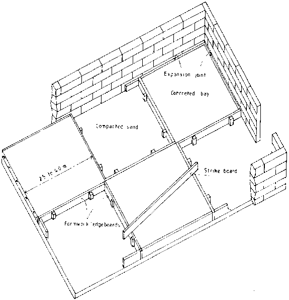 Solid concrete floors should be laid on a level and tampered base of hardcore or gravel. On well drained sites also sand or even laterite can be satisfactory. The base layer should be at least 100mm thick. While it is desirable for the finished floor level to be at least 150mm above the surrounding ground, some fill may be required under the base course. However, fill need to be thouroughly compacted to get the required stability and, generally, it is therefore more satisfactory to increase the thickness of the base course. Any material used for fill or for the base course must be free of organic matter. hence, the excavated top soil must be rejected as fill. If a damp-proof barrier (polythene or a 3mm thick hot bitumen layer) is to be installed, a layer of sand should be spread over the base. Sand can also be used as blinding on a hardcore base to reduce the amount of concrete that 'disappears' in the gaps between the stones. Finally, 75 to 150mm timber screeds are put in place to be used as guides in striking off and leveling the concrete and reinforcement bars, if advocated, are put in position. The thickness of the slab will depend on the expected loads, the quality of concrete used, reinforcement and the bearing characteristics of the ground.
