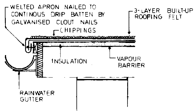 For net roofs two or three layers of felt are used, the first being laid at right angles to the slope commencing at the eaves. If the decking is timber the first layer is secured with large flat-head felting nails and the subsequent layers are bonded to it with layers of hot bitumen compound. If the decking is of a material other than timber all three layers are bonded with hot bitumen compound. While it is still hot the final coat of bitumen is covered with a layers of stone chippings to protect the underlying felt, provide additional fire resistance and give increased solar reflection. An application of 20 kg/mē of 12.5mm chippings of limestone, granite or light-coloured gravel is suitable.