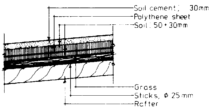 The supporting structure should be generously designed of preservative - treated or termite-resistant timber of poles, and inspected and maintained periodically, as a sudden collapse of this heavy structure could cause great harm. The durability of the mud cover can be improved by stabilizing the top soil with cement, and it can be waterproofed by placing a plastic sheet under the soil. Figure 5.38 and Figure 5.39 shows two types of earth roofs.