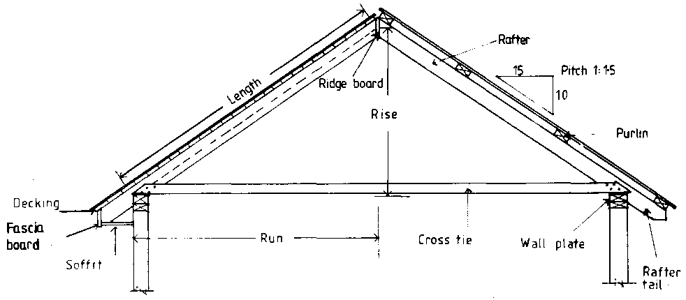 A gable roof normally has a centre ridge with a slope to either side of the building. With this design a greater free span (7 to 8m) is possible with timber rafters than with a monopitch roof. Although the monopitch design may be less expensive in building widths up to 10m the inconvenience of many support columns favors the gable roof. The gable roof may be built in a wide range of pitches to suit any of several different roofing materials. Figure 5.41 shows a number of the elements that are associated with a gable roof. The following description is keyed to the figure: