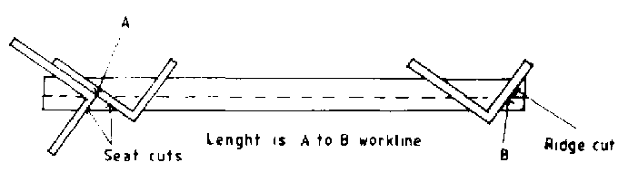 The angle of the ridge and seat cuts can be laid out on the rafter using a steel carpenter's square and the appropriate rise and run values both on the outside of the blades or both on the inside of the blades of the square, 30 and 20cm in the example in Figure 5.42. The length may be found with the pythagorean theorem using the rise and run of the rafter. The length is measured along the workline.