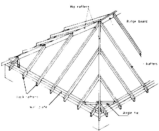 The rafters can be of round or sawn timber or when wider spans are required, of timber or steel trusses which can be supported on a continuous wall or on posts. The inclined rafters of a pitched roof meet the wall plates at an angle and their load tends to make them slide off the plate. To reduce this tendency and to provide a horizontal surface through which the load may be transferred to the wall without excessively high compressive forces, the rafters in pitched roofs are notched over the plates. To avoid weakening of the rafter, the depth of the notch (seat cut) should not exceed one-third that of the rafter. When double rafters are used a bolted joint is an alternative. The rafters should always be thoroughly fixed to the walls or posts to resist the uplifting forces of the wind.