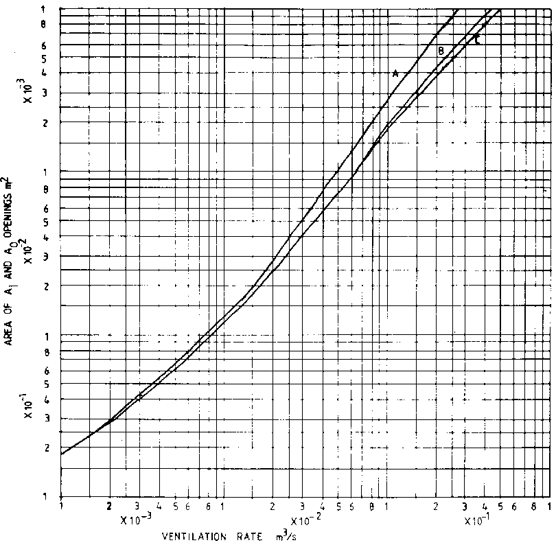 To determine the inlet and outlet areas required to provide a given ventilation rate by thermal convection, the following equation based on stack effect theory can be used: