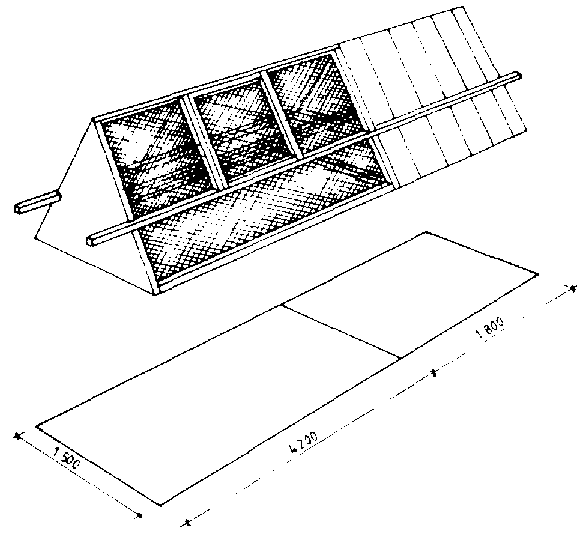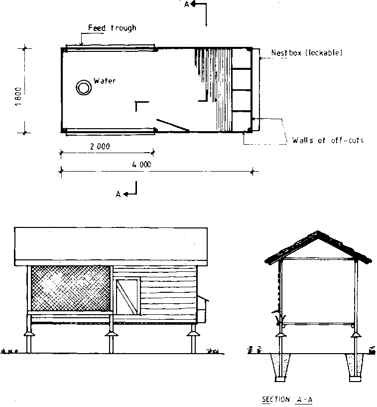 A small house of this type with slatted floor is shown in Figure 10.41. Alternatively wire mesh can be used for the floor. It is built on treated wooden piers 0.8 to 1m above the ground. Ventilation and manure removal are both facilitated, no litter is required and bird density can be 6 to 8 per m². Feeding, watering and egg gathering are all efficiently handled from the outside. Either a double pitch thatch roof or a single pitch corrugated steel roof may be installed with the eaves about 1.5m above the floor. If the latter is used, some insulation under the roof is desirable. The feed troughs should be equipped with hinged covers and rat guards should be installed at the top of each pier. The width of this type of building should be limited to about 2m to allow easy removal of manure and adequate wall space for feed and nests. The building should be oriented east and west and may be of any length. However, if it is more than 5m long, nests will need to be put on the sides and all remaining wall space on either side used for feeders in order to allow the required 100mm/bird. See Table 10.13.