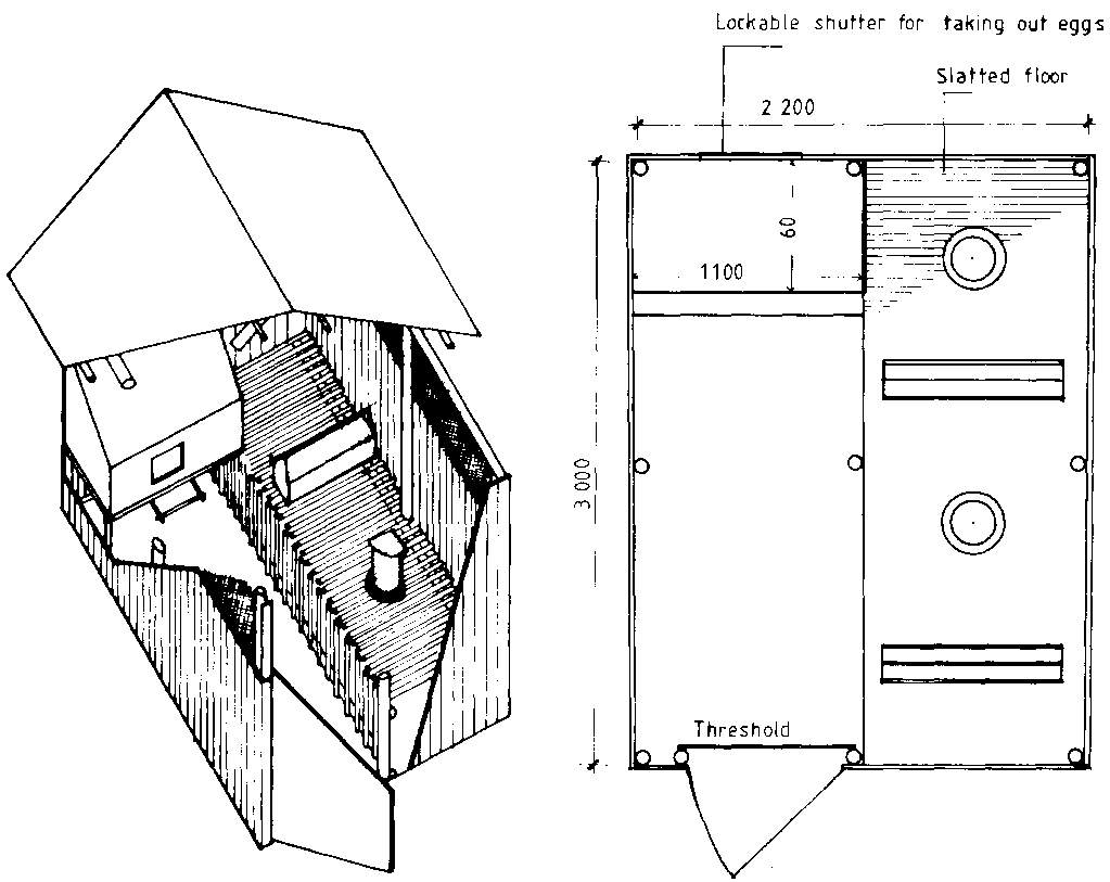 Figure 10.42 Poultry house fot 40 layers half deep litter/ half slatted floor.
