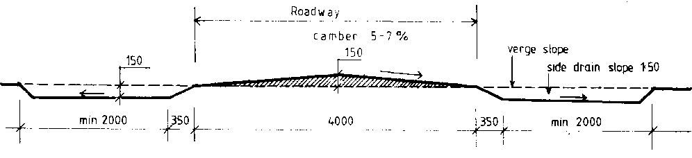 The side drains are then shaped with a gentle slope of 1 :150 away from the road. The verge and back edge of the drain are shaped with a slope of about 3:1, thus avoiding the need for meeting bays, since vehicles can use the verge when meeting.