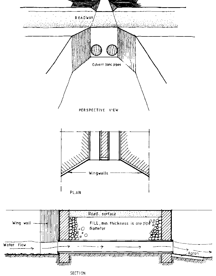 Concrete pipes, 400 to 900mm in diameter, are often used for culverts. The diameter and number of pipes is determined by the expected water flow. Alternatively corrugated steel pipes or masonry work in burnt bricks, concrete blocks or stone may form the culvert. Temporary structures may be constructed with logs, which are notched and fitted together. The bottom of the culvert should be laid on or slightly above the bed of the stream to avoid silting. Regular maintenance to clear the culvert of any silt or debris is essential.