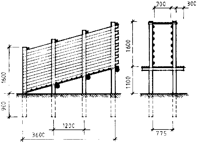 The fences of the holding and forcing yards should be at least 1.65m high if large active zebu cattle are to be retained. Posts 150 to 200mm in diameter should be set at least 0.8m into the ground and spaced not more than 2.5m apart. Four 150mm or five 100mm rails are attached to the inside of the posts with slightly larger spacing at the top of the fence.
