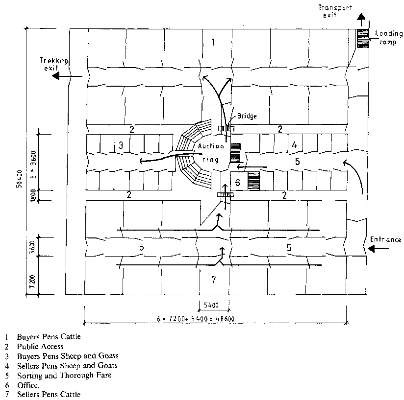The auction system demands both good management and a well prepared sales yard. Figure 13.24a shows the principles of a sales yard for approximately 500 cattle and 350 sheep and goats. The yard is calculated for 40 cattle/ sheep in each pen or 1.3m²/cattle and 0.25m²/sheep or goat.