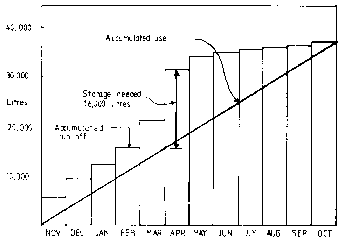 If a dependable, continuous source of water is available, no storage facilities are required. However, with an intermittent supply, storage is essential! The theoretical size of the storage required is determined by multiplying the total daily needs, such as the family, livestock and irrigation, by the number of days expected to be without rain. However, it is the amount of water that is available for storage that is likely to be the limiting factor. Water used during the accumulation period must be subtracted from the total.