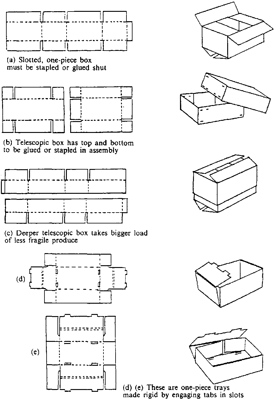6.5.3 Cardboard (sometimes called fibreboard). Containers are made from solid or corrugated cardboard. The types closing with either foldover or telescopic (i.e. separate) tops are called boxes or cases. Shallower and opentopped ones are called trays. Boxes are supplied in collapsed fore, (that is, flat) and are set up by the user. The setting-up and closing of boxes requires taping, glueing, stapling or the fixing of interlocking tabs (Figure 6.3).