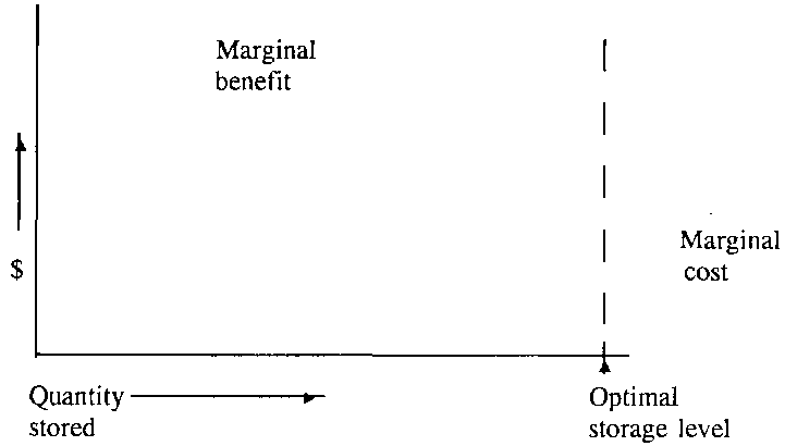 Farmers, traders and governments all have reasons to store grain, but they also have reasons for limiting the amount of storage. The unit costs of storage tend to be constant (or to decrease slowly) as larger quantities are stored, but the benefits fall off as more is stored. In deciding how much to store, the benefits must be balanced with the costs involved (see Figure 1.2: Balancing the Supply and Demand for Storage.).