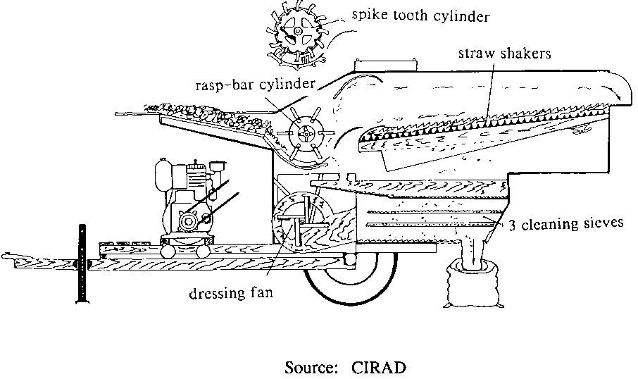 In France, CIRAD-SAR has designed and developed a machine which strips panicles from the plants and threshes them in only one pass (Figure 4.5). The stripper has been specially designed for harvesting paddy rice on small plots. The essential component is a wire looped in line with the direction of movement of the machine, which is mounted on a three-wheeled carriage and powered by a 9hp engine. With a 30 cm working width the stripper capacity is about 1 ha per day.