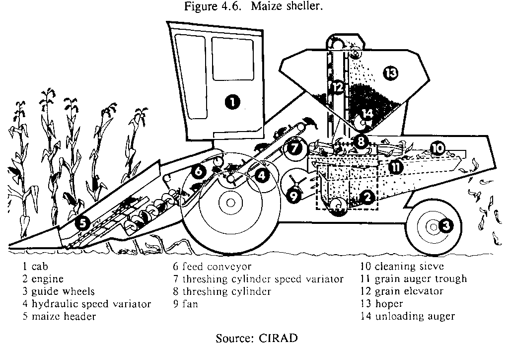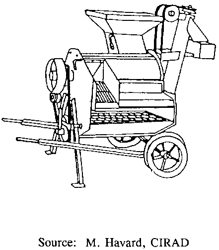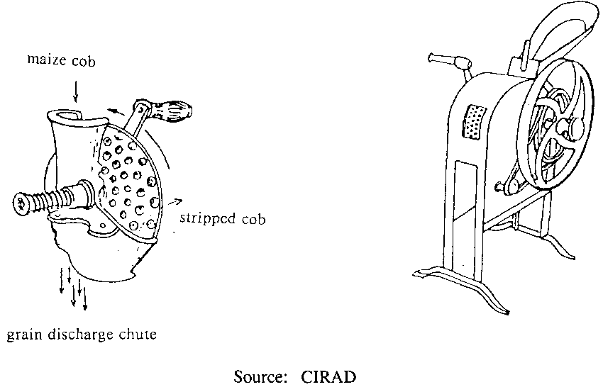 Nowadays many small maize shellers, equipped with a rotating cylinder of the peg or bar type, are available on the market. Their output ranges between 500 and 2000kg per hour, and they may be driven from a tractor power take off or have their own engine; power requirements vary between 5 and 15hp according to the equipment involved. For instance the French Bourgoin "Bamba" model (Figure 4.8. "Bamba" motorized maize sheller.) seems well-suited to rural areas in developing countries because of its simple design, easy handling and versatility (maize, millet sorghum, etc.).