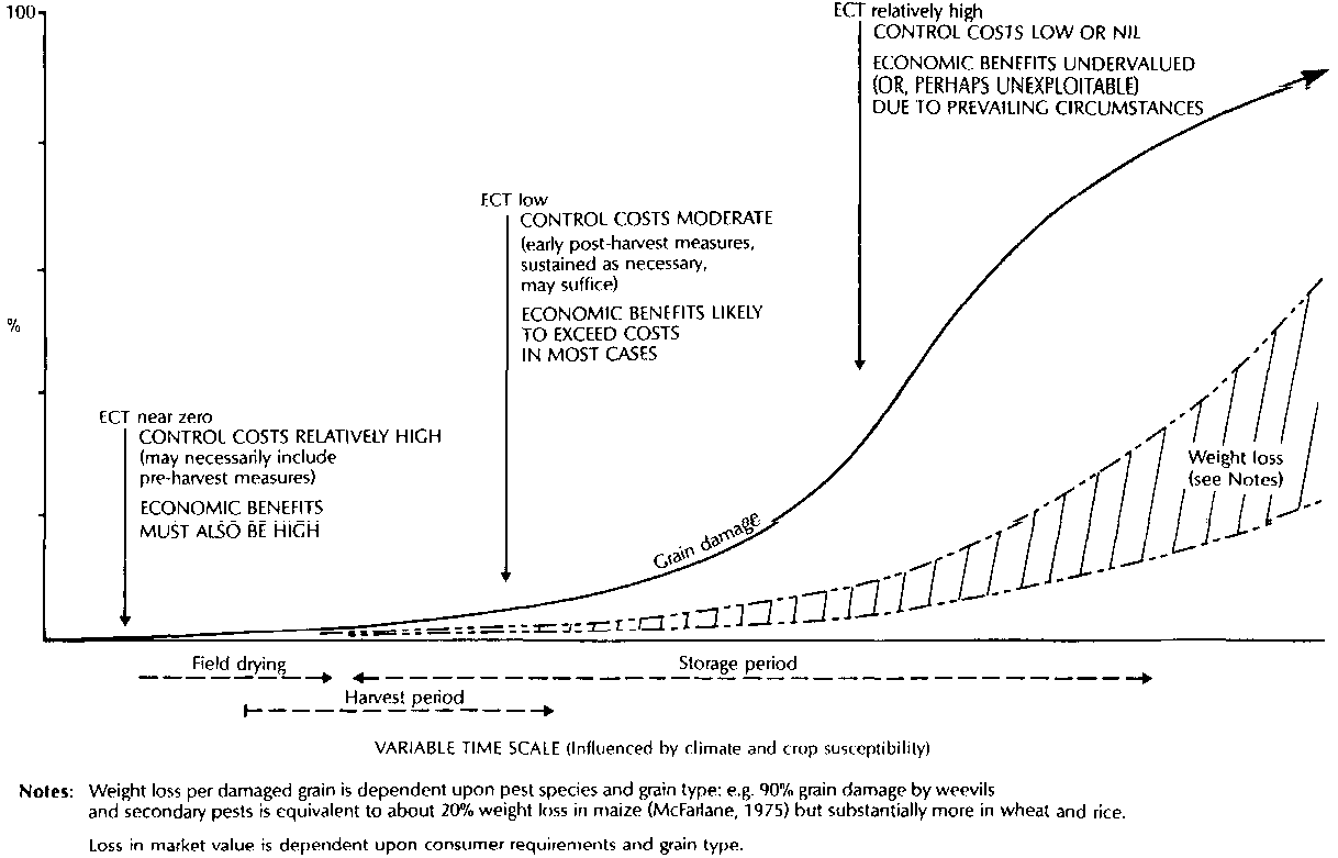 Modern theories of pest management have also generated the concept of economic control thresholds (ECTs). An ECT is most simply defined as the level of pest damage which justifies, in cost/benefit terms, the expenditure of resources upon control actions (Hebblethwaite, 1985). It is always a variable threshold because the costs and benefits of any action will depend upon the situation and its circumstances. An ECT is situationspecific. This is especially true, and not only for postharvest pest control, when one considers the great differences in opportunities and constraints between the small farm level in developing countries and more sophisticated levels of operation. Nevertheless, it is possible to generalise to some extent (Figure 8.1. Conceptual control thresholds for insects on stored grains). For insect control in grain storage the ECT is likely to be at or very close to zero: