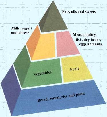 The Food Guide Pyramid is one example of a national food guide. Prepared for consumers in the United States, the pyramid shows the recommended proportions of the various categories of food. It is easy to see that for most Americans, the daily food intake should include a high proportion of cereals, fruits and vegetables whereas fats, oils and sweets are best eaten in moderation.