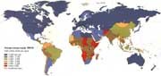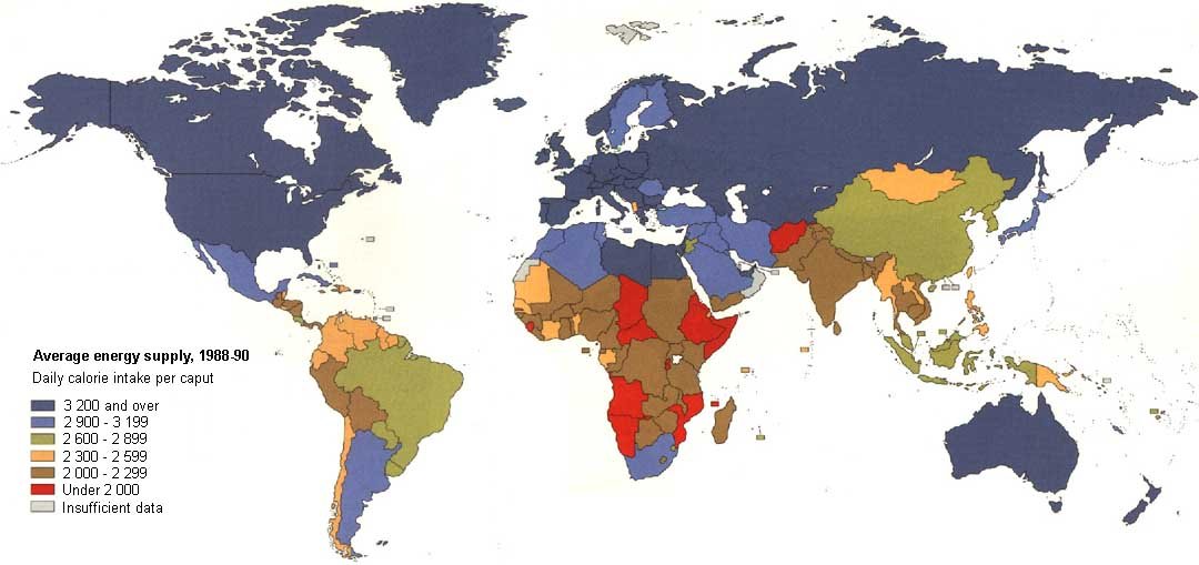 The FAO-WHO Consultative Group on Nutrition has determined that, on average, a daily diet of around 2 200 calories is sufficient to meet basic nutrition needs. Like all averages this conceals important differences. Boundaries of nations formed since 1990 (in former USSR, in former Yugoslavia, in former Czechoslovakia, Eritrea) are shown in grey.