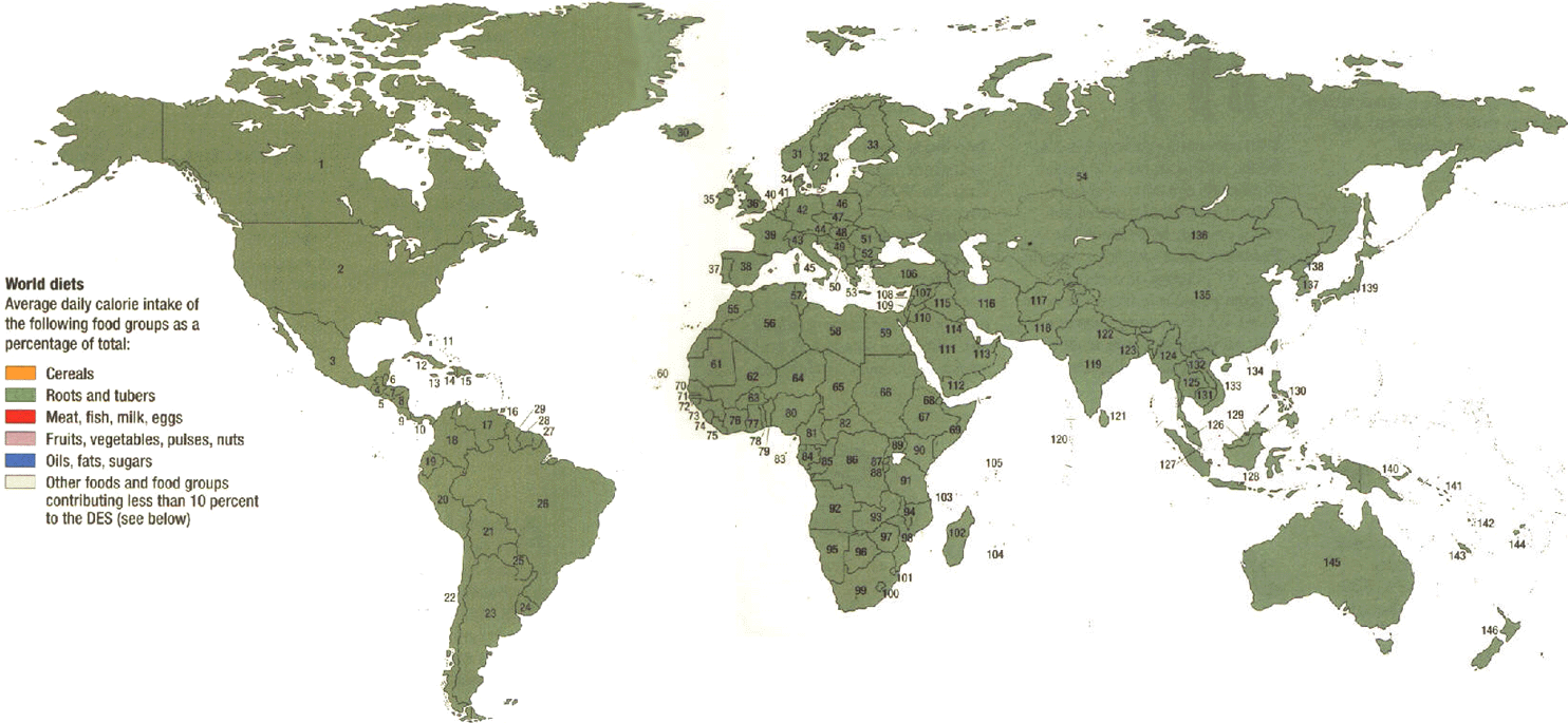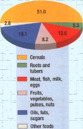 The main staple foods in the average African diet are (in terms of energy) cereals (46 percent), roots and tubers (20 percent) and animal products (7 percent). |