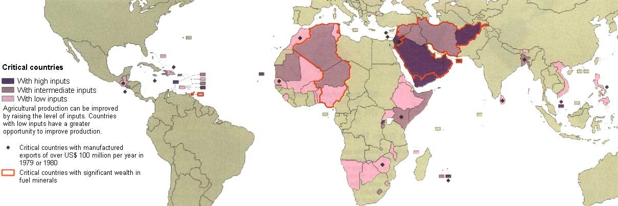 Countries with high levels of manufactured exports, mineral or fossil resources are more likely to be able to afford to import food and fertilizers. The map shows countries which, with differing levels of agricultural inputs such as fertilizers and irrigation, are projected to be dependent on food imports by the year 2000.