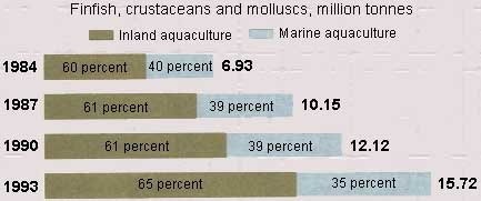 Asia accounted for nearly 87 percent of the world's fish farming output in 1993: 63 percent of its share was produced by China, with India as the next biggest contributor.