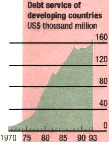 The debt crisis dates from the oil price rises of the early 1970s. Commercial banks, flooded with money from the oil-exporting nations, found eager borrowers in developing countries. A major attraction for many of them was the low, often negative, interest rates. In theory the loans were to fund projects which would generate enough money to repay them; in practice this often failed to happen. In April 1982, as interest rates soared, Mexico said that it could no longer pay even the interest on its debt. Other countries followed.