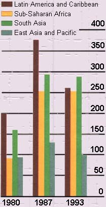 Over the past ten years, about 80 percent of the debts owed by the developing countries to commercial banks have been renegotiated on more favourable terms. This restructuring and rescheduling (lowering debt service costs by spreading the debt over a longer period of time) has eased the burden of the most indebted continent, Latin America. Some countries have had part of their debt forgiven.