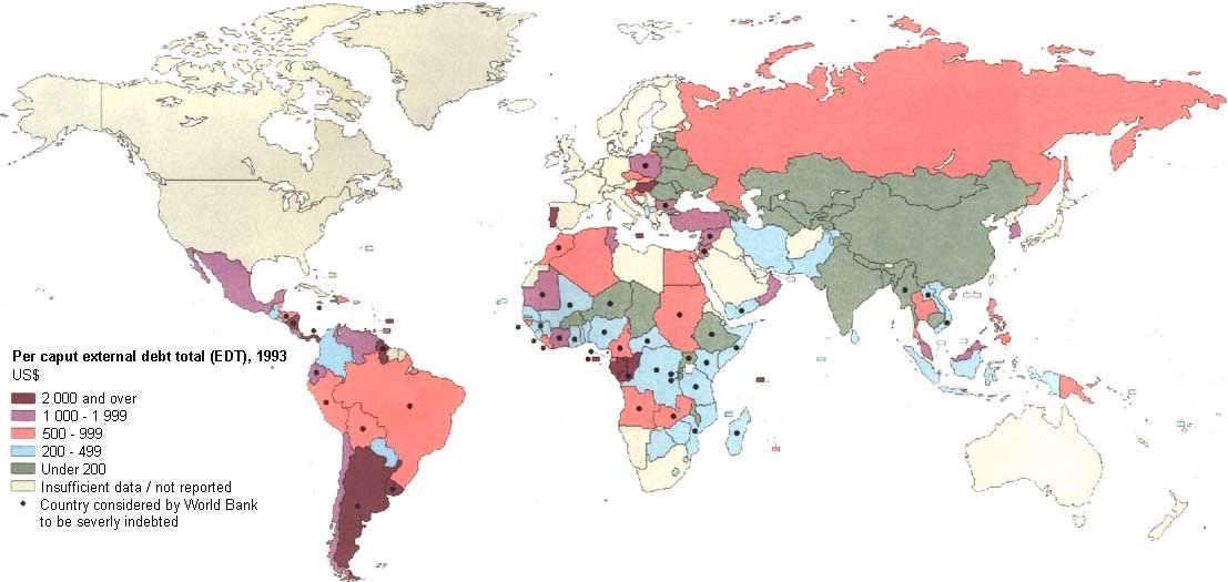 In 1994, the developing countries as a whole owed an estimated US$ 1 800 000 million to banks, governments and multilateral institutions in the industrialized countries-the equivalent of half their entire annual trade. Servicing these huge debts diverts funds from urgently needed social and economic development.