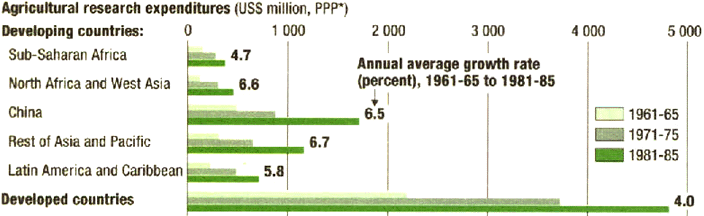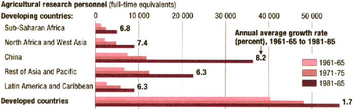 Until the second half of this century, agricultural research focused largely on the needs of industrialized countries; where it reached the developing countries, it was directed for the most part towards crops that were important to the developed world. After the Second World War - and particularly after the food crisis of the 1960s - the focus began to change. International research centres were founded and local scientists trained. Sub-Saharan Africa now has four times more scientists than it did in 1961, although expenditure on research has fallen.
