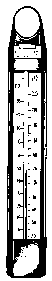 A special thermometer that reads up to 150°C is required and the bulb of the thermometer should be protected by a metal casing to protect it against breaking (Figure 47: A thermometer suitable for measuring the high temperatures in jam boiling). In general mercury thermometers should not be used in food premises.