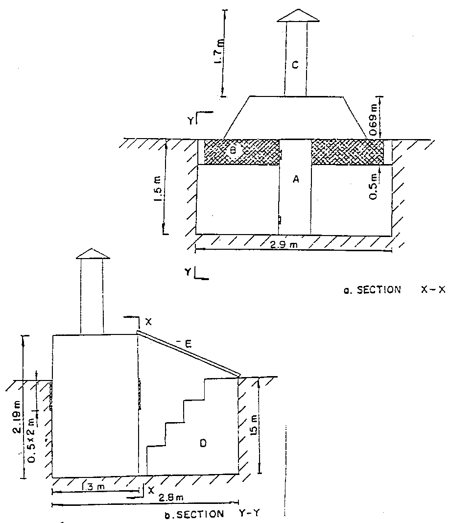 The Department of Rural Engineering at the University of Nigeria at Nsukka has designed a ventilated cellar for yam storage (Figure 2.1). The cellar measures 2.9m long by 1.3m wide and 1.5m deep. The roof, in the shape of a cupola, protects the cellar against penetration of rain water. Grilled openings (B in the figure) and a chimney (C) in the centre, improve the ventilation level. The chimney, painted black, accentuates air movement.