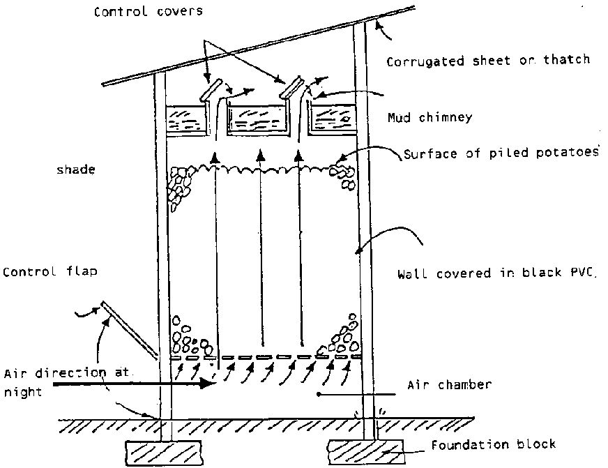 The FAO/UNDP project in Cameroon entitled "Development of Post-Harvest Systems", has designed and promoted a small mud structure for storing about a tonne of potatoes (Figure 2.4).