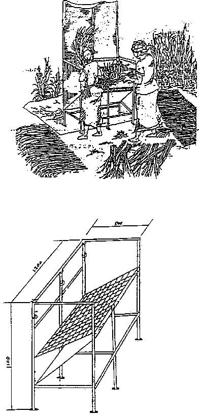 With the objective of facilitating the threshing of long strewed rice at the site of harvesting, an FAO project has introduced a modified version of the threshing table used in Asia, adapted to local conditions (Manalili, 1994). Threshing is effected by beating sheaves of rice against an interwoven grille of bars forming an inclined trellis (Figure 3. 3). This model was modified during the course of the project by lowering the table with respect to the ground and by using branches of neem and mangrove, more resistant to termites, for the bars of the grille. A more solid metallic model has also been constructed for irrigated rice.