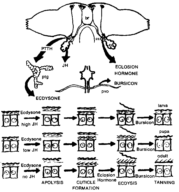Cuticle synthesis and moulting are controlled by three groups of growth regulators - the brain hormones, the ecdysones and the juvenile hormones. Under normal concentrations, these growth regulatiors also control other developmental processes in insects including sexual maturation, colour differentiation and reproduction.