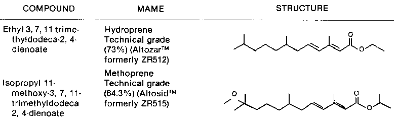 Many compounds that possess activity to naturally occurring insect hormones have subsequently been developed, a vast majority of which has an acyclic terpenoid skeleton to which various functional groups are attached. Naturally occurring juvenile hormones isolated from the tobacco hornworm, Manduca sexta (L.) have been terpenoid ethers, epoxidised aromatic ethers, bans, bans dienoate ethers and unepoxidised dienoates.