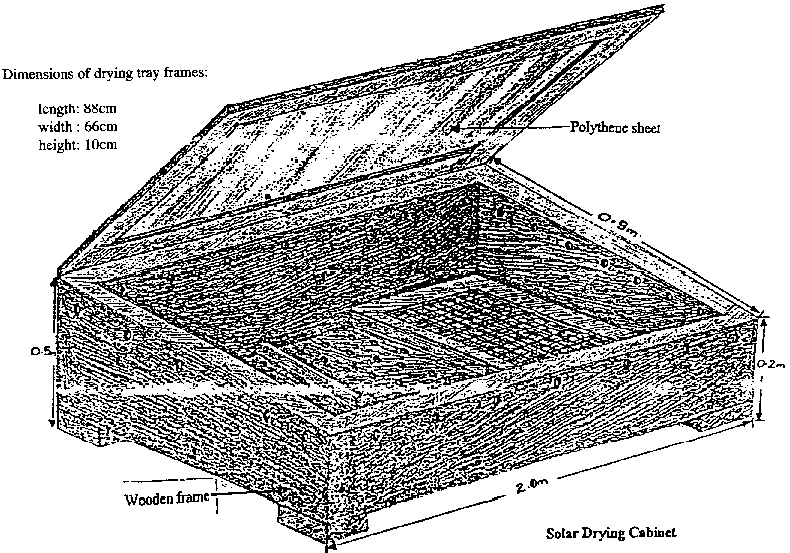 The solar drying cabinet is made from 2.5 cm thick wood, which is painted black all over. The black surface absorbs heat from the sun and helps to raise the temperature of the air inside the cabinet to facilitate a faster rate of drying the product. The frame of the lid is a made of thin, lightweight wood ( also painted black ) which supports a sheet of clear plastic. The clear plastic cover allows the suns energy to enter the cabinet and heat the air inside. The base and upper edges of the cabinet are perforated with 1 cm diameter holes at intervals of 1- cm. The holes allow air to circulate freely throughout the chamber of the cabinet and remove the water which is being evaporated from the food material. The food material is placed on a series of wooden framed trays within the cabinet. The frames of the trays are made of a lightweight wood which support fine mesh material ( such as mosquito netting; ). The trays sit on 2.5 cm square pieces of wooden rods so that they do not touch the based of the cabinet. This again facilitates the free movement of air around the product and a faster rate of drying.