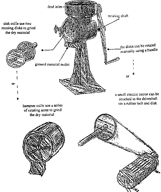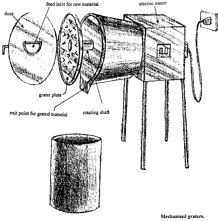 Coconut graters are readily available on the local market. Mechanised graters are useful for commercial operations only. The supplier of the mechanised grater illustrated below is given in Annex 1.